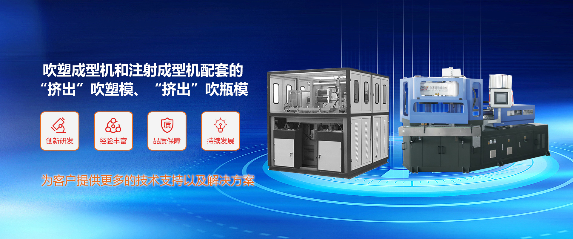 公司可為廣大用戶提供:吹塑成型機和注射成型機配套的“擠出”吹塑模、“擠出”吹瓶模、三工位“注--吹”模、PET瓶坯模、PET瓶坯模、熱流道瓶蓋模等,公司專注注吹模具設計方面技術,可為使用國外各種品牌(如美國的WHEATON、美國的JOMAR、意大利的UNILOY等)全自動三工位“注吹”成型機的吹瓶廠商提供模具配套,同時也可為國內全自動三工位“注吹”成型機制造公司提供模具配套服務。